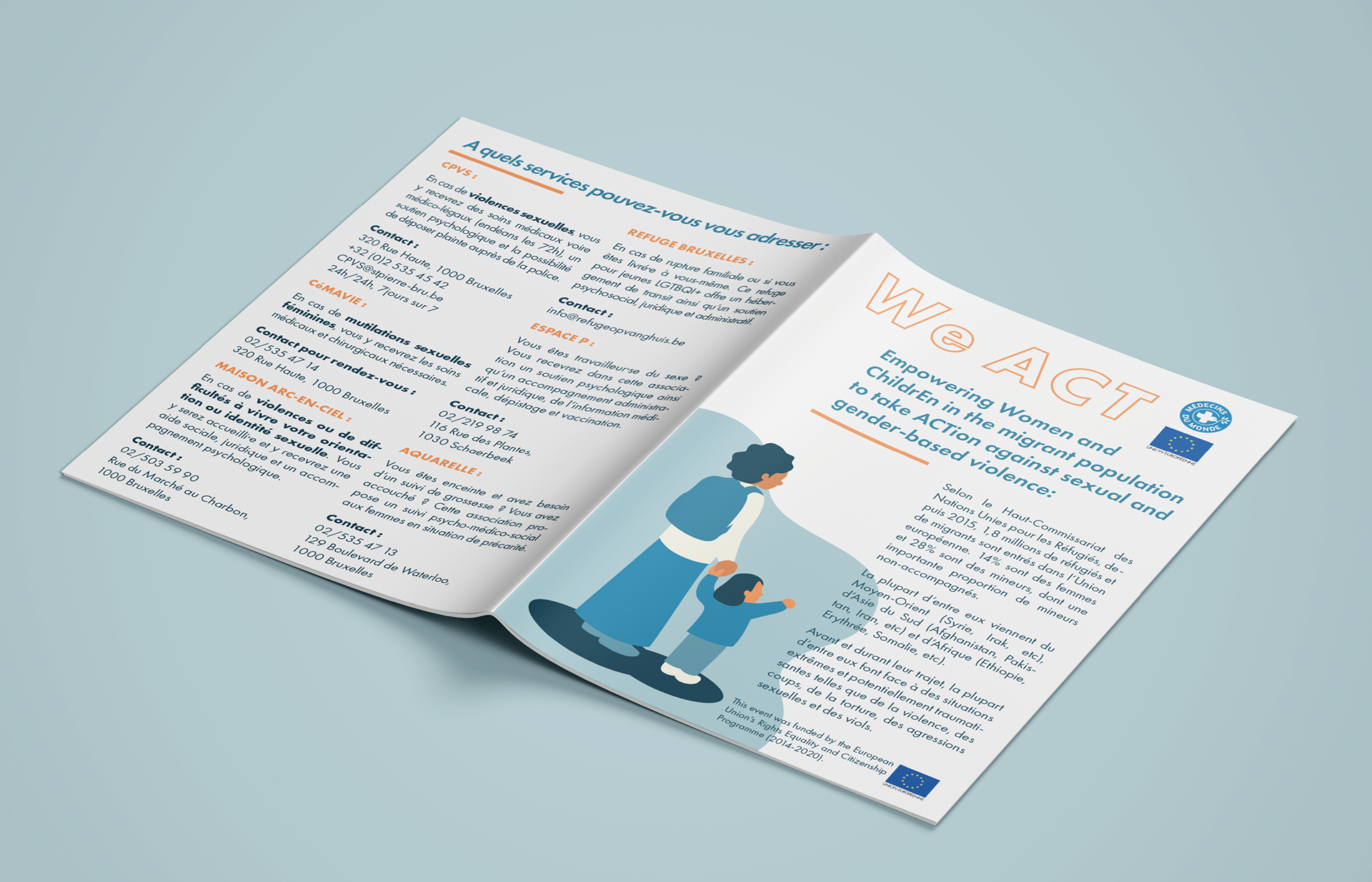 Collaboration avec Médecins du Monde Belgique pour la mise en page et l'illustration de la brochure We ACT visant à sensibiliser autour des violences liées au genre.